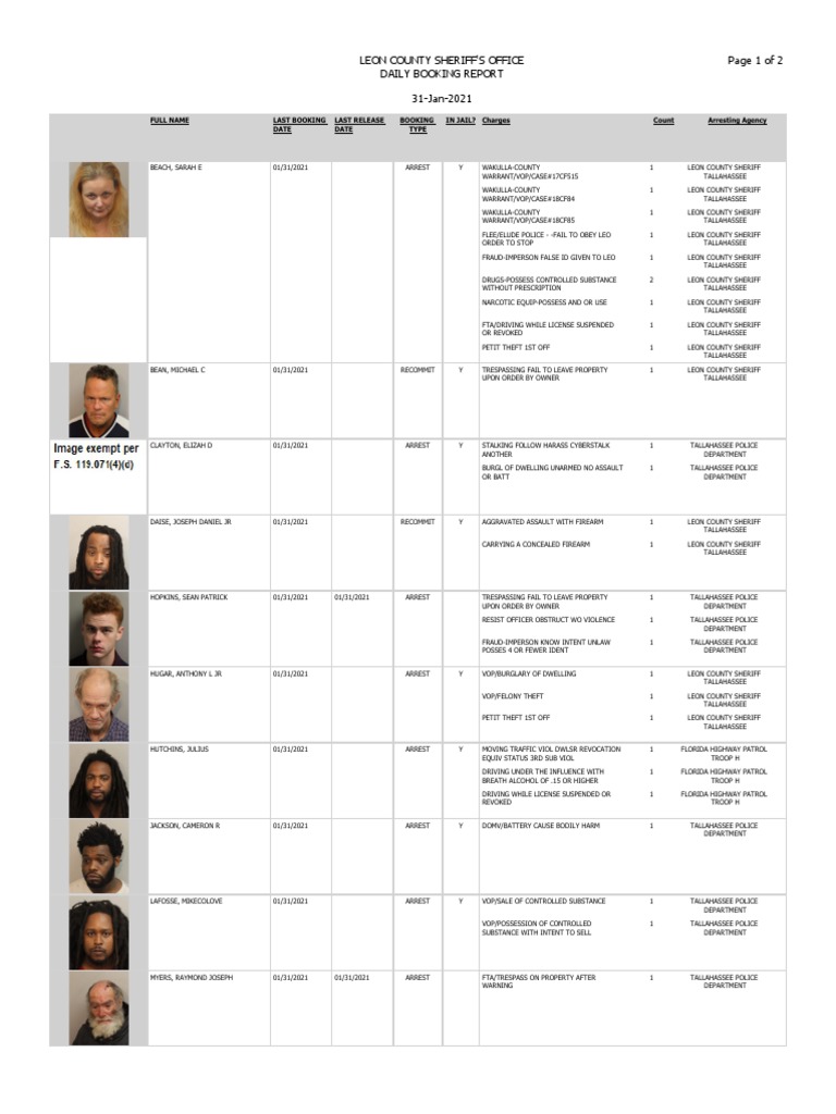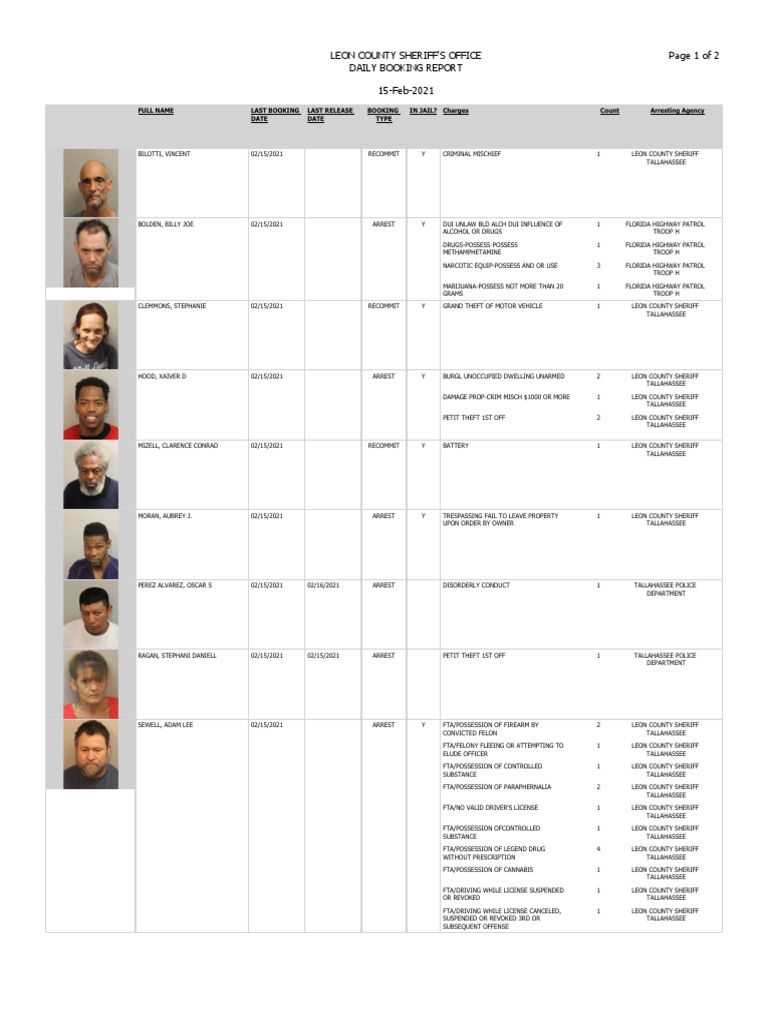 Charges count arresting agency date date type. Leon County Booking Report. 22-oct-2021 full name last booking last release booking in jail.